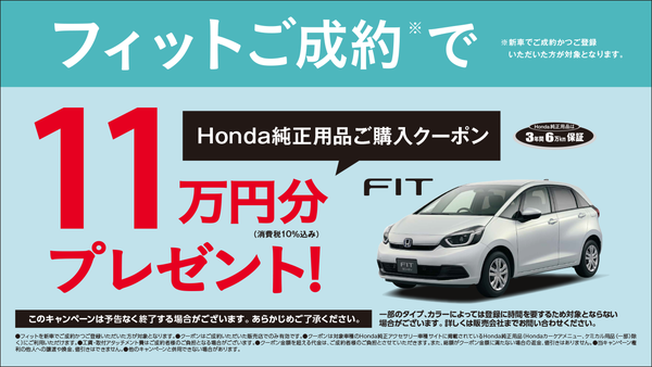 - フィットの新車をご成約かつ登録で「Honda純正用品ご購入クーポン 11万円分」プレゼント!